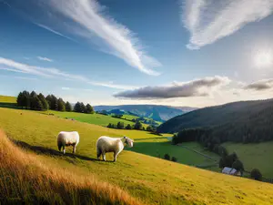 Schilderachtig berglandschap met twee witte schapen die grazen op een zonovergoten helling. De glooiende groene weiden worden omlijst door donkere dennenbossen, terwijl vederenwolken zich uitstrekken tegen een helderblauwe hemel. Een perfect vastgelegd moment van landelijke rust en natuurlijke harmonie.