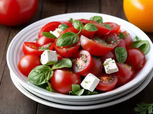 Geniet van deze kleurrijke tomatensalade met verse basilicum. Perfect voor een gezonde maaltijd of als bijgerecht. Download nu voor uw culinaire projecten!