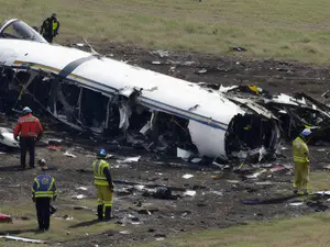 Hulpdiensten bij vliegtuigongeval op open terrein tijdens onderzoek AI-gegenereerd