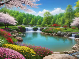 Betoverend lentetafereel van een weelderige tuin met kristalheldere waterval en turquoise vijver. De bloeiende kersenbloesems, kleurrijke voorjaarsbloemen en groene bomen creëren een harmonieus geheel. Natuurlijke rotspartijen en zorgvuldig aangelegde borders maken dit tot een droomachtig tuinlandschap dat perfect is voor sfeervolle tuininspiratie.