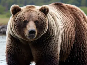 Krachtige close-up van een majestueuze bruine beer in zijn natuurlijke omgeving. De gedetailleerde vacht en expressieve ogen zijn perfect vastgelegd, terwijl de beer bij het water staat. Deze hoogwaardige natuurfoto toont de indrukwekkende uitstraling van deze machtige predator in het wild.