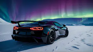 Een spectaculaire hypercar met iriserende chameleon-afwerking en rode LED-achterlichten staat op een bevroren sneeuwvlakte onder een prachtig noorderlicht. De Aurora Borealis straalt in levendige groene, paarse en blauwe tinten boven het arctische landschap. De carbon spoiler en zwarte velgen completeren het futuristische design in deze magische winterse setting.