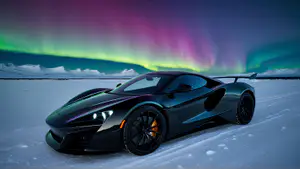 Een elegante hypercar met iriserende zwarte carrosserie en oranje remklauwen staat op een bevroren sneeuwvlakte onder een adembenemend noorderlicht. De Aurora Borealis straalt in levendige groene, paarse en blauwe tinten boven het arctische landschap met sneeuwbedekte bergtoppen. Deze magische winterscène combineert automotive luxe met natuurs spectaculairste lichtshow.