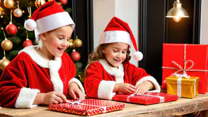 Sfeervolle kerstscène met kinderen in rode kerstoutfits die enthousiast cadeautjes inpakken. De warme setting wordt versterkt door een versierde kerstboom met gouden en rode ballen op de achtergrond. Het authentieke houten bureau en de warme verlichting creëren een gezellige decembersfeer perfect voor feestelijke content.