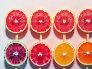 Artistieke compositie van vrolijke fruitplakken op stokjes, gepresenteerd als verfrissende ijsjes. De levendige kleuren van grapefruit, watermeloen en sinaasappel creëren een speels patroon tegen een zachte achtergrond. perfect voor gezonde lifestyle content, zomerse recepten of creatieve food styling projecten.
