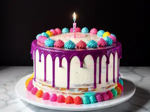 Stijlvolle dripcake met opvallend paars glazuur dat sierlijk langs de witte basis druppelt. De taart is rijkelijk versierd met kleurrijke toefjes in turquoise, roze en geel, perfect gerangschikt in een feestelijk patroon. Een brandende verjaardagskaars vormt het stralende middelpunt van deze moderne designertaart.