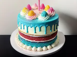 Spectaculaire dripcake in turquoise, rood en wit met een prachtige blauwe glazuurdrip. Versierd met kleurrijke meringue toefjes, vrolijke snoepjes en een roze verjaardagskaars. De perfecte showstopper voor elke feestelijke gelegenheid, met een professionele afwerking en moderne uitstraling.