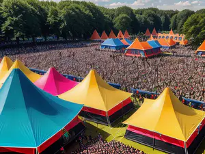 Levendig beeld van een drukbezocht Nederlands zomerfestival met karakteristieke puntdaktenten in opvallende kleuren zoals geel, turquoise en roze. De festivaltenten steken af tegen een groene bosrijke achtergrond, terwijl duizenden bezoekers het terrein vullen. perfect voor content over festivals, evenementen en zomeractiviteiten.