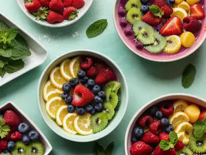 Stijlvol gefotografeerde fruitbowls gevuld met een kleurrijke mix van vers fruit op een mintgroene achtergrond. De kommen bevatten een perfecte compositie van sappige aardbeien, blauwe bessen, kiwischijfjes, citroenschijven en verse muntblaadjes. Ideaal voor gezonde ontbijtrecepten en food content.