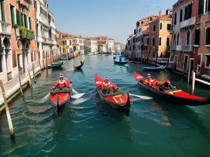 Levendige sfeerimpressie van een typisch Venetiaans kanaal met drie rode gondels die tussen de karakteristieke pastelkleurige paleizen door varen. Het turquoise water weerspiegelt de historische architectuur met zijn kenmerkende bogen en balkons. perfect beeld voor reisbrochures, toeristische websites of artikelen over Italië.