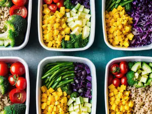 Professioneel voorbereide maaltijdcontainers gevuld met een regenboog aan verse ingrediënten. Elke box bevat een perfecte mix van kleurrijke groenten zoals broccoli, rode kool, gele paprika, snoeptomaatjes en volkoren granen. Ideaal voor gezonde lunch op kantoor of bewuste weekplanning.
