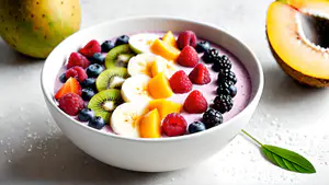 Verfrissende paarse smoothie bowl gevuld met een kleurrijke mix van vers fruit en bessen. De kom bevat laagjes banaan, kiwi, mango, frambozen, blauwe bessen en bramen, artistiek gepresenteerd in een witte kom. perfect voor een voedzaam en Instagram-waardig ontbijt of als gezonde snack tussendoor.