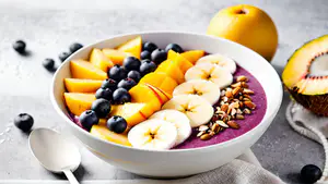 Voedzame smoothie bowl met een paarse basis, verfraaid met vers gesneden mango, banaan en blauwe bessen. Verrijkt met knapperige amandelen voor extra textuur. perfect voor food fotografen, gezondheidscoaches en restaurants die hun gezonde menukaart willen illustreren. De levendige kleuren en zorgvuldige presentatie maken deze foto ideaal voor so...