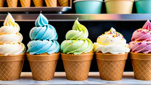 Verfrissende compositie van vijf ambachtelijke softijs hoorntjes in verschillende pastelkleuren, van vanille tot mintgroen en roze. Elk hoorntje is perfect gedraaid en versierd met kleurrijke toppings. De traditionele wafelhoorntjes zijn gevuld met romig schepijs, ideaal voor menu's van ijssalons of social media content.