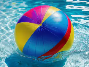 Levendige opname van een klassieke strandbal in vrolijke regenboogkleuren, drijvend op het glinsterende turquoise zwembadwater. De bal heeft een traditioneel streeppatroon in geel, blauw, rood en paars. Het zonlicht creëert speelse reflecties op het wateroppervlak, wat zorgt voor een uitnodigende zomerse sfeer.