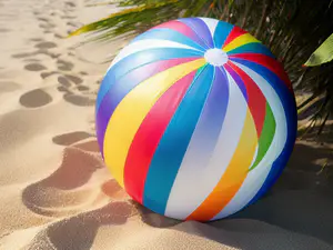 Levendige opblaasbare strandbal met regenboogkleurige strepen rust op goudkleurig zand, omlijst door schaduwspel van palmbladeren. De vrolijke kleuren blauw, geel, rood en groen creëren een perfecte zomerse vakantiesfeer. Ideaal voor strandplezier en zomerse marketingcampagnes.