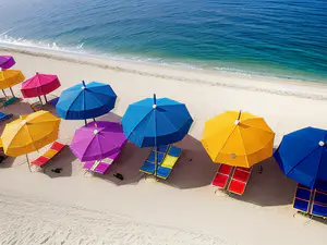 Levendige compositie van felgekleurde strandparasols en ligbedden op een hagelwit strand langs turquoise water. De parasols in geel, blauw, roze en paars vormen een vrolijk patroon tegen het heldere zeelandschap. perfect voor reisbrochures, vakantieadvertenties of zomerse marketingcampagnes.