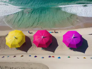 Sfeervolle drone-opname van drie levendige parasols in geel, roze en paars op een verlaten strand. Het contrast tussen de felgekleurde parasols en het turquoise zeewater creëert een tropische vakantiesfeer. perfect voor reisbrochures, toeristische websites of zomerse marketingcampagnes.