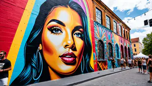 Indrukwekkende street art muurschildering tijdens een levendig stadsfestival. De kleurrijke compositie toont een portret in levendige kleuren tegen een regenboogachtige achtergrond. Het kunstwerk siert een historisch pand waar festivalbezoekers langs wandelen, wat zorgt voor een boeiend contrast tussen moderne straatkunst en klassieke architectuur.