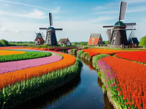 Adembenemend Nederlands landschap met traditionele windmolens tegen een blauwe lucht, omringd door golvende stroken felgekleurde tulpenvelden in rood, roze en oranje. Een karakteristieke waterweg slingert tussen de bloeiende bollenvelden door, wat zorgt voor een iconisch beeld van Nederlands cultureel erfgoed en agrarische expertise.