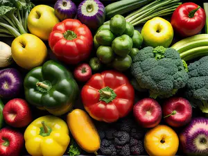 Deze levendige afbeelding toont een gevarieerde mix van kleurrijke groenten en fruit, perfect voor promoties van gezonde levensstijl of voedingswinkels in Nederland. Perfect voor commercieel en persoonlijk gebruik.