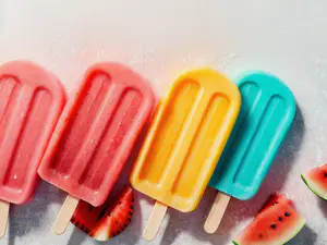 Vrolijk gekleurde waterijsjes op een rij met watermeloenstukjes als decoratie. De frisse kleuren rood, geel en turquoise creëren een zomerse sfeer. perfect voor foodfotografie, reclame of promotie van verfrissende zomerse traktaties. De ijsjes stralen een uitnodigende frisheid uit tegen een lichte achtergrond.