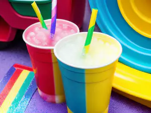 Verfrissende zomerdrankjes in vrolijke wegwerpbekers met felgekleurde rietjes op een paarse ondergrond. De levendige combinatie van rood, geel en blauw creëert een feestelijke sfeer. perfect voor zomerfeesten, kinderpartijtjes of een gezellige picknick in de zon.