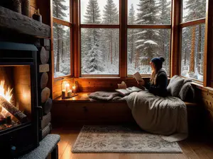 Sfeervolle winterse setting in een berghut met warme houtkachel en panoramisch uitzicht op besneeuwde dennenbomen. De knusse leeshoek bij het raam is ingericht met zachte plaids en kussens, terwijl kaarslicht voor extra warmte zorgt. perfect voor een ontspannen winterdag met een goed boek in een rustgevende omgeving.
