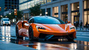 Een elegante koper-oranje supercar met blauwe getinte ruitpartij staat op een spiegelend nat wegdek in een levendig stadscentrum tijdens de avonduren. De strakke aerodynamische lijnen, zwarte velgen en rode remklauwen contrasteren prachtig met de glimmende natte straat. Kantoorgebouwen met warme verlichting vormen een stijlvolle achtergrond in deze stedelijke setting.