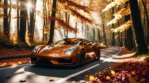 Een glanzende koperkleurige sportwagen rijdt over een slingerend weggetje door een betoverend herfstbos. Gouden zonnestralen breken door de bomen en verlichten de vuurrode en oranje bladeren. Gevallen herfstbladeren versieren de weg terwijl de aerodynamische lijnen van de auto perfect contrasteren met de natuurlijke schoonheid van dit seizoensgebonden tafereel.
