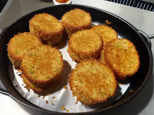 Goudbruin gebakken aardappelrösti met een perfect krokante buitenkant, bereid in een klassieke gietijzeren pan. Deze handgemaakte rösti's zijn ideaal als bijgerecht of vegetarische hoofdmaaltijd. De knapperige korst en zachte binnenkant zorgen voor een heerlijke textuurcombinatie die past bij vele gerechten.