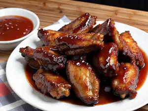 Sappige, gelakte kippenvleugels geserveerd met een glanzende Aziatische barbecuesaus. De krokant gebakken wings zijn perfect gekarameliseerd en worden begeleid door een extra dipschaaltje saus. Een populair gerecht dat perfect is als borrelhapje of hoofdmaaltijd met een oosterse twist.