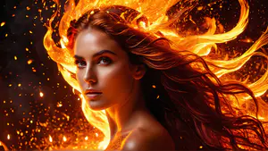 Dramatische kunstfoto met spectaculaire vuureffecten en vlammende haarstijling tegen een donkere achtergrond. De warme oranje tinten en dansende vonken creëren een betoverend fantasy-effect. perfect voor creatieve projecten, boekomslagen of artistieke campagnes die kracht en passie willen uitstralen.