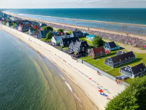 Luchtfoto Nederlandse strandhuizen aan Noordzeekust tijdens zomerdag AI-gegenereerd