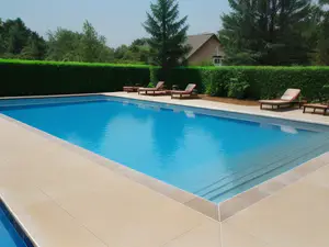 Stijlvol privézwembad met een moderne uitstraling, omzoomd door een perfect onderhouden groene haag. De lichtblauwe kleur van het water contrasteert prachtig met de beige terrastegels en comfortabele ligbedden. Een perfecte setting voor ontspanning en luxueus buitenleven in eigen tuin.