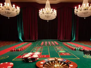 Sfeervolle opname van een exclusieve casino roulette tafel met klassiek groen vilt en rode fiches. De ruimte straalt pure luxe uit met drie imposante kristallen kroonluchters en rijke fluwelen gordijnen in bordeauxrood en smaragdgroen. perfect voor content over casino's, gokken en hoogwaardige entertainment-locaties.