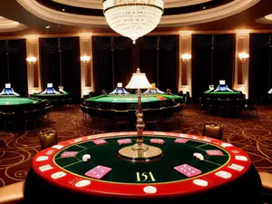 Stijlvolle casino speelzaal met elegante blackjack tafels in klassiek groen en rood. De ruimte straalt luxe uit met een imposante kristallen kroonluchter, sfeervolle wandverlichting en chique fluwelen gordijnen. Het interieur combineert tijdloze grandeur met professionele speelfaciliteiten voor een authentieke casino-ervaring.