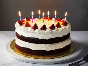 Feestelijke twee-laags chocoladetaart rijkelijk versierd met verse slagroom en rode aardbeien. De brandende verjaardagskaarsjes zorgen voor een warme sfeer. perfect voor speciale gelegenheden zoals verjaardagen of jubilea. De combinatie van donkere chocoladecake met luchtige room en fruit creëert een klassieke uitstraling.