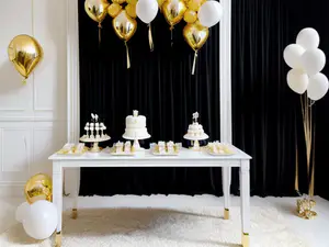 Elegant gedecoreerde feesttafel in zwart-wit met gouden accenten. De witte tafel presenteert verschillende niveaus van taarten en zoetigheden, versierd met luxe metallic gouden en witte heliumballonnen tegen een dramatisch zwart gordijn. perfect voor exclusieve bruiloften en jubileumvieringen waar stijl centraal staat.