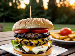 Ambachtelijke dubbele cheeseburger geserveerd op een vers sesambroodje met gesmolten kaas, sappige tomaten en knapperige sla. De burger is perfect gegrild met karakteristieke grillstrepen en wordt gepresenteerd tegen een sfeervolle zonsondergang op een houten tuintafel. Een ultieme combinatie van smaak en presentatie.