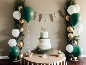 Stijlvolle feestdecoratie met elegante ballonnenboog in smaragdgroen, wit en goud. Centraal staat een moderne drieLaagse taart op een champagnekleurige tafel. De decoratie combineert dennengroen met luxe ballonnen voor een tijdloze uitstraling. perfect voor exclusieve feesten en ceremoniële gelegenheden.