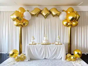 Stijlvolle feestopstelling met elegante gouden ballonnenboog en drie identieke witte bruidstaarten op een gedrapeerde tafel. De decoratie combineert luxueuze goudkleurige sterballonnen met klassieke witte accenten, perfect voor een exclusief bruiloftsfeest of chique evenement. De witte gordijnen vormen een strakke achtergrond voor deze feestelij...