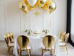 Stijlvolle feesttafel met elegante witte tafellinnen en opvallende gouden designstoelen. De setting wordt verrijkt door gouden en witte heliumballonnen, een subtiele sterrendecoratie aan de muur en verfijnde bloemstukken. perfect voor exclusieve diners, jubilea of moderne bruiloften waar luxe en minimalisme samenkomen.