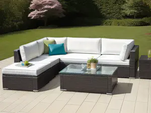 Stijlvolle wicker loungeset in antraciet met comfortabele witte kussens, perfect voor een moderne tuin of terras. De set bestaat uit een ruime hoekbank, glazen salontafel en decoratieve sierkussens in turquoise. Het geheel staat op een lichte tegelvloer met een groene tuin als achtergrond, ideaal voor ontspannen buitenleven.