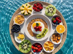 Weelderige ontbijtpresentatie op een rieten dienblad, drijvend op turquoise zwembadwater. Een centrale kom yoghurt met granola wordt omringd door kleurrijke verse fruitsoorten zoals kiwi, frambozen, sinaasappel en blauwe bessen. perfect voor luxe hotels, resorts of culinaire content die een exclusieve vakantiesfeer uitstraalt.