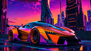 Een aerodynamische sportwagen in opvallend oranje en paarse tinten schittert op een reflecterend wegdek. Op de achtergrond rijst een indrukwekkende futuristische skyline op tegen een dramatische lucht met levendige roze, paarse en oranje kleuren van de ondergaande zon.