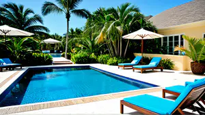 Stijlvolle tropische villa met een uitnodigend zwembad omringd door wuivende palmbomen. Het ruime terras is voorzien van comfortabele ligbedden in turquoise en elegante witte parasols. De weelderige tropische tuin creëert een exclusieve resort-sfeer, perfect voor luxe vakanties of high-end vastgoedfotografie.