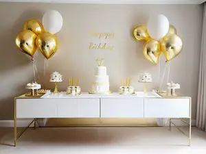 Stijlvolle verjaardagstafel met een modern wit-goud kleurenschema. Het elegante dressoir presenteert een centrale witte taart, omringd door verfijnde zoetigheden op verhoogde standaards. Gouden en witte heliumballonnen zorgen voor een feestelijke touch, terwijl de minimalistische opzet luxe uitstraalt.