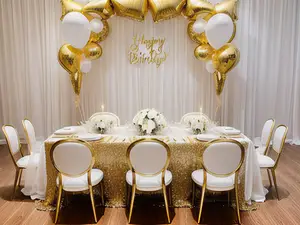 Stijlvolle feesttafel in wit en goud met elegante ballondecoratie. De tafel is gedekt met wit linnen en een gouden pailletten tafelloper, omringd door chique witte stoelen met gouden frames. Boven de tafel hangt een luxe ballonboog met gouden sterballonnen en witte accenten. perfect voor exclusieve verjaardagen en feestelijke gelegenheden.