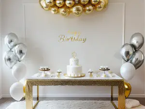 Stijlvolle verjaardagstafel met een moderne gouden en witte kleurstelling. De elegante opstelling bevat een witte taart als middelpunt, omringd door desserts en versierd met gouden en zilveren ballonnen. De gouden tafel en 'Happy Birthday' tekst op de achtergrond creëren een luxueuze sfeer voor een bijzondere gelegenheid.